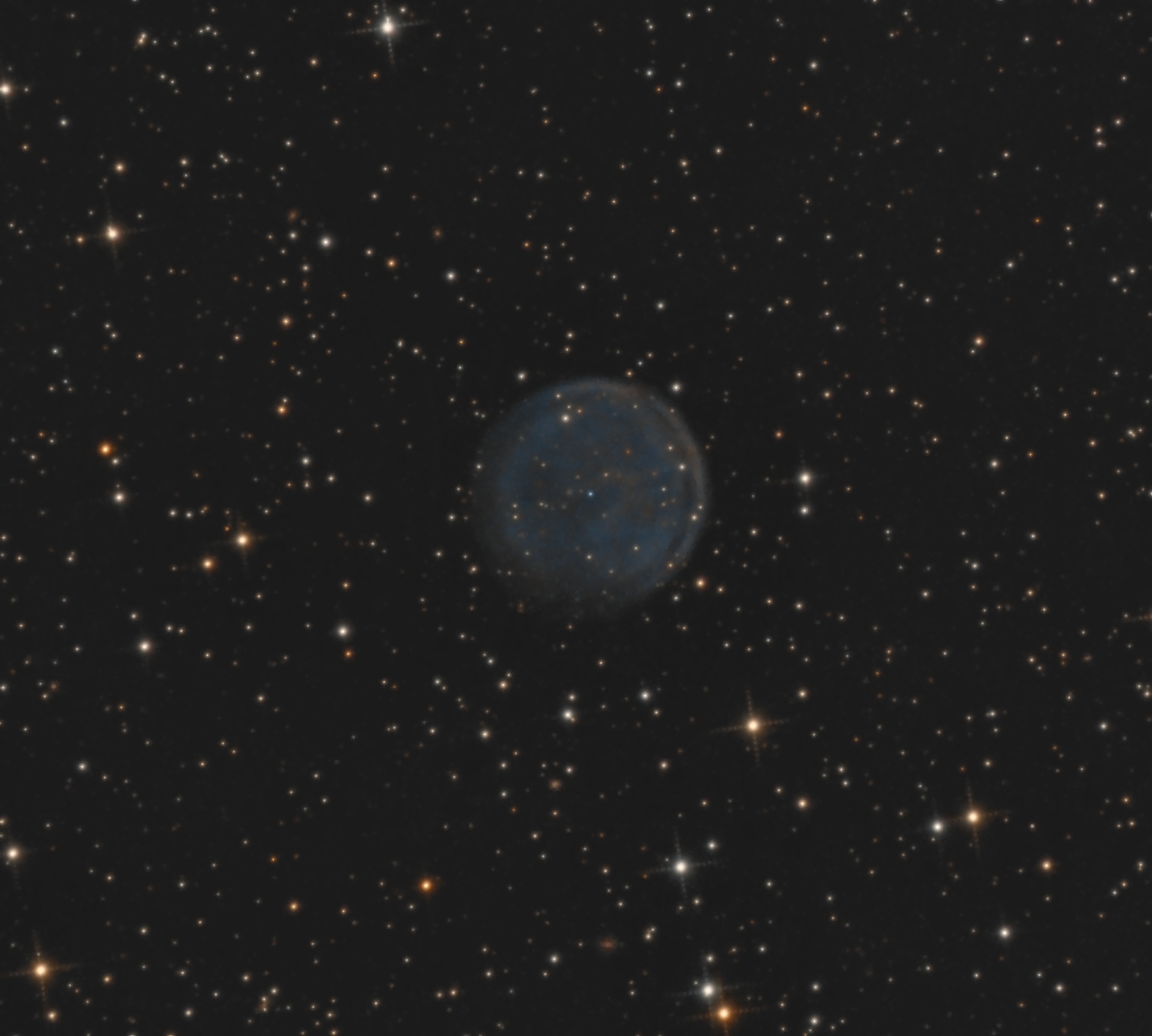 | Object: Abell 61, planetary nebula in Cygnus Telescope: Astrograph 400 f/4 Newton (APM 1.5x multiplier/corrector up to 2440mm fl). Paramount ME. Camera: Artemis ART4021. Astronomik LRGB filters. Exposures: Halpha : 39 x 15' ( 9:45 ) Oiii : 132 x 15' (33:00 ) R: 15 x 10' ( 2:30 ) G: 15 x 10' ( 2:30 ) B: 15 x 10' ( 2:30 ) Resolution: 0.39"/pixel (drizzle resampled). Oiii FWHM after integration: 2.6" Guiding: Moravian G0 on Off-Axis Guider Date: March - August 2019 Site: Sagan Observatory Las Rozas (Spain) - mag 4.5 suburban skies - |