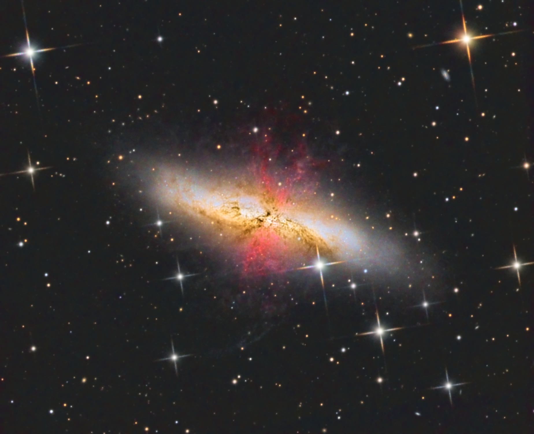 | Object: M82, starburst galaxy in Ursa Maior Telescope: Astrograph 400 f/4 Newton (APM 1.5x multiplier/corrector up to 2440mm fl). Paramount ME. Camera: ccd Artemis ART4021. Astronomik LRGB filters. Baader Halpha. Exposures: L : 151 x 10' (25:10 ) R: 44 x 10' ( 7:20 ) G: 36 x 10' ( 6:00 ) B: 45 x 10' ( 7:30 ) Halpha: 75 x 15' (18:45 ) Resolution: 0.42"/pixel (drizzle resampled) Guiding: Moravian G0 on Off-Axis Guider Date: January - February 2019 Site: Sagan Observatory Las Rozas (Spain) - mag 4.5 suburban skies - |