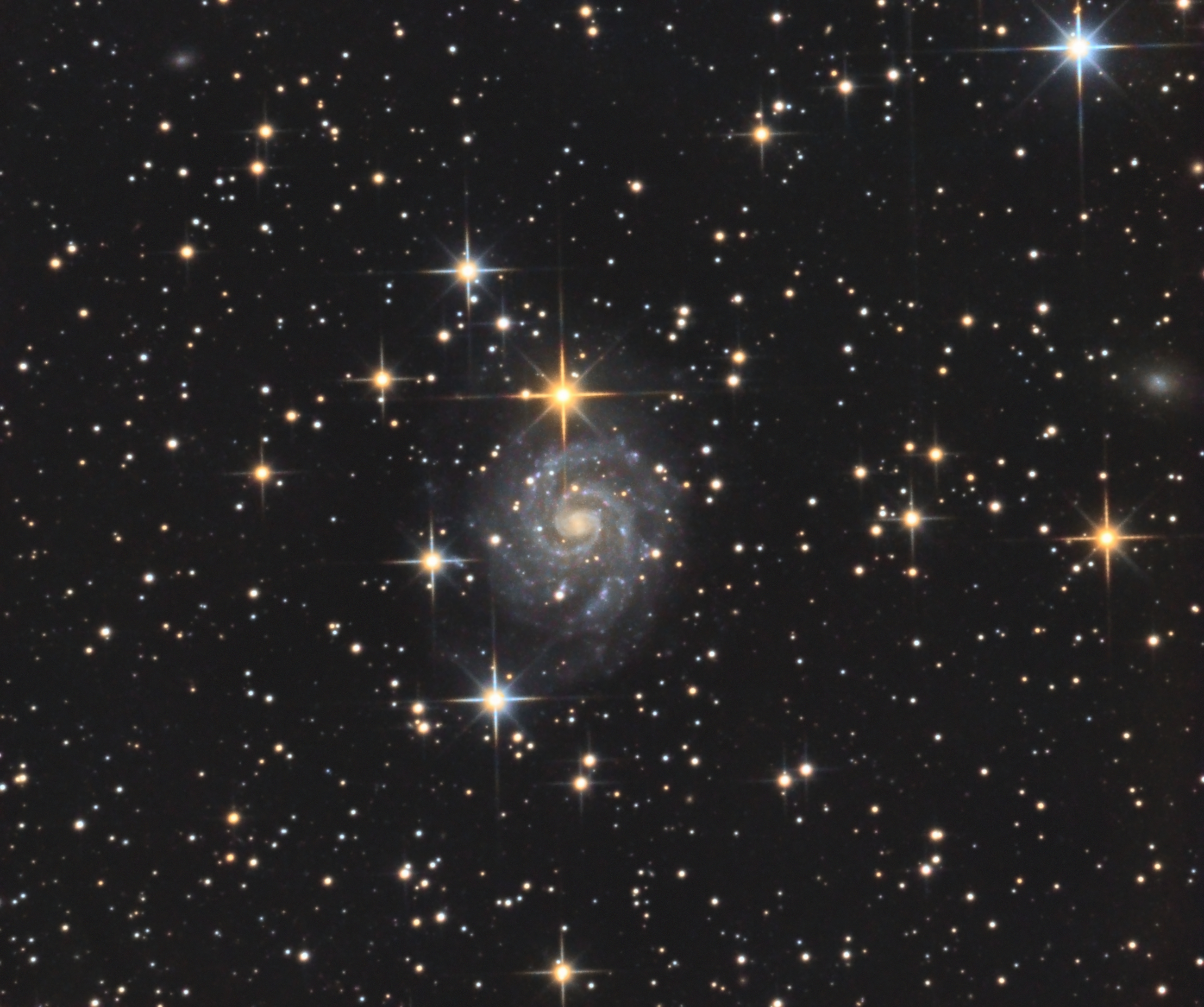 | Object: IC 239, face-on spiral galaxy in Andromeda Telescope: Astrograph 400 f/4 Newton (APM 1.5x multiplier/corrector up to 2440mm fl). Paramount ME. Camera: Artemis ART4021. Astronomik LRGB filters. Exposures: L : 150 x 10' (25:00 ) R: 14 x 10' ( 2:20 ) G: 14 x 10' ( 2:20 ) B: 14 x 10' ( 2:20 ) Resolution: 0.42"/pixel (drizzle resampled) Guiding: Moravian G0 on Off-Axis Guider Date: December 2017 - December 2018 Site: Sagan Observatory Las Rozas (Spain) - mag 4.5 suburban skies - |