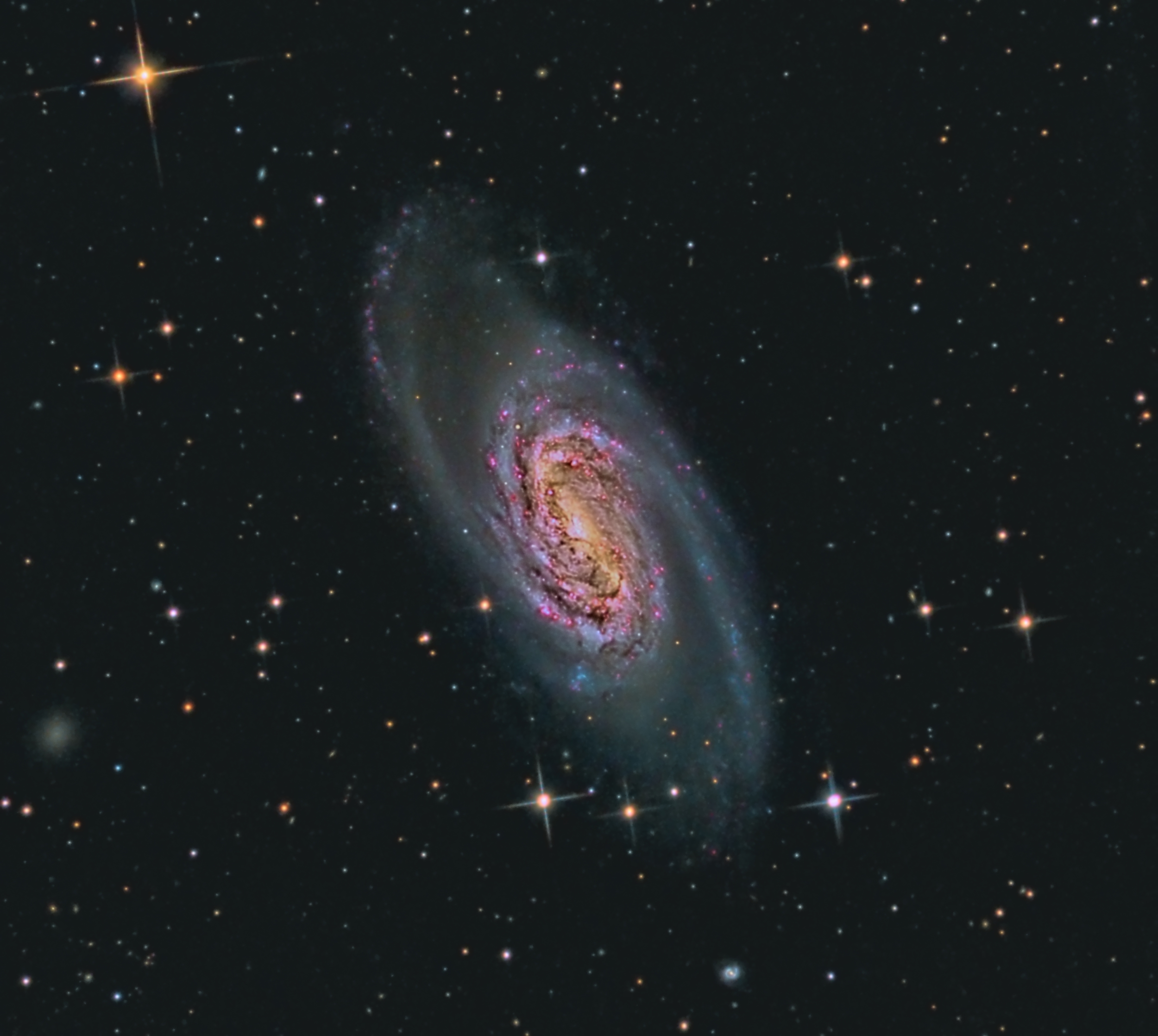 2903, spiral galaxy in Leo Telescope: Astrograph 400 f/4 Newton (APM 1.5x multiplier/corrector up to 2440mm fl). Paramount ME. Camera: Artemis ART4021. Astronomik LRGB filters. Exposures: L : 95 x 10' (15:50 ) R: 36 x 10' ( 6:00 ) G: 36 x 10' ( 6:00 ) B: 36 x 10' ( 6:00 ) Halpha: 85 x 15' (21:15 ) Resolution: 0.42"/pixel (drizzle resampled) Guiding: Moravian G0 on Off-Axis Guider Date: February 2019 Site: Sagan Observatory Las Rozas (Spain) - mag 4.5 suburban skies - |